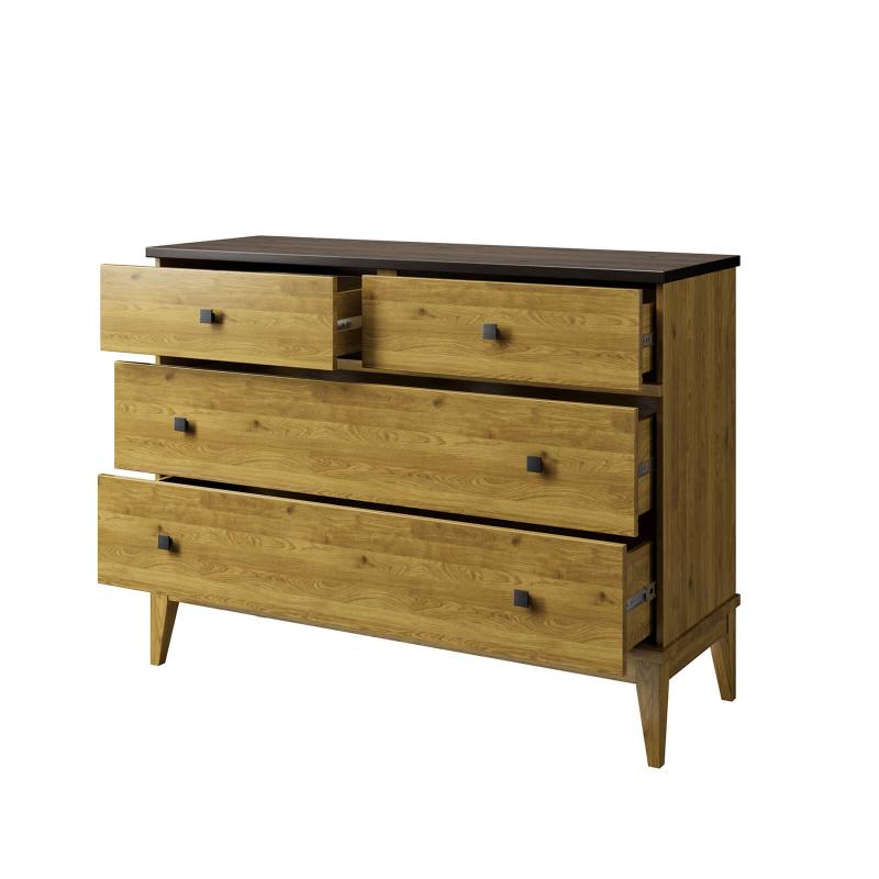 Комод оснащен двумя широкими и и двумя узкими ящиками. Высокие ножки обеспечивают оптимальный доступ при уборке.