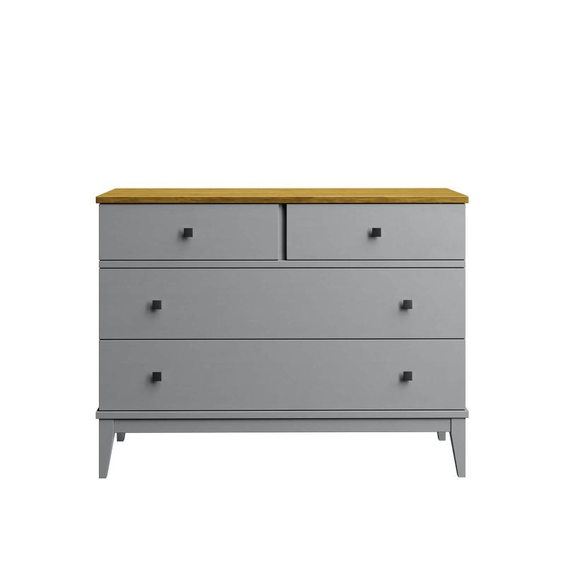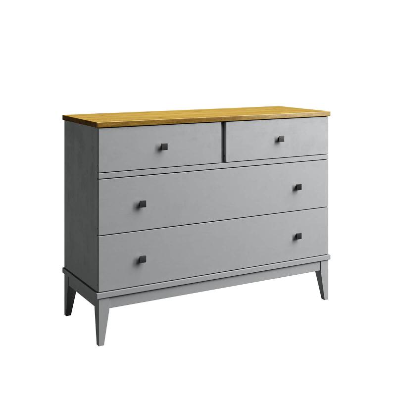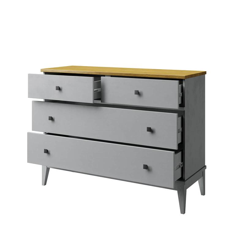 Комод оснащен двумя широкими и и двумя узкими ящиками. Высокие ножки обеспечивают оптимальный доступ при уборке.