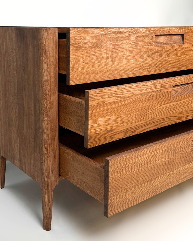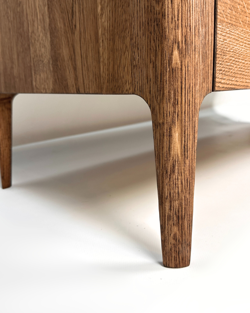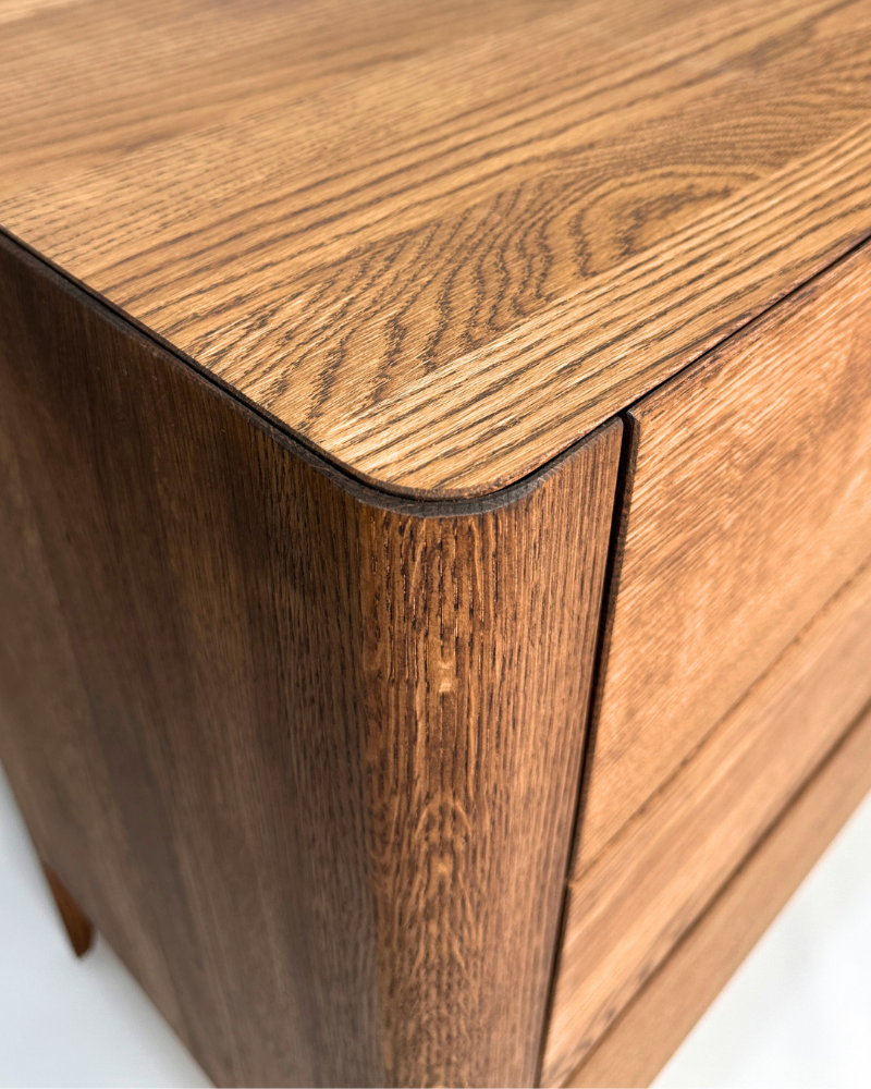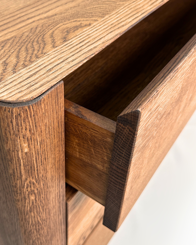 Скруглённые углы (передний и задний край) — смягчают силуэт мебели, придают ей элегантность и делают безопаснее в повседневном использовании. Тонкие изящные столешницы — визуально облегчают конструкцию, создавая ощущение невесомости.