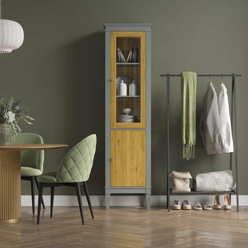 Оптимальная организация пространства. Четыре вместительные полки за двумя типами дверей — стеклянной и глухой — позволяют гибко подходить к хранению: демонстрировать красивые предметы сервировки или скрывать повседневные вещи от взгляда.