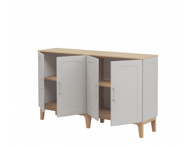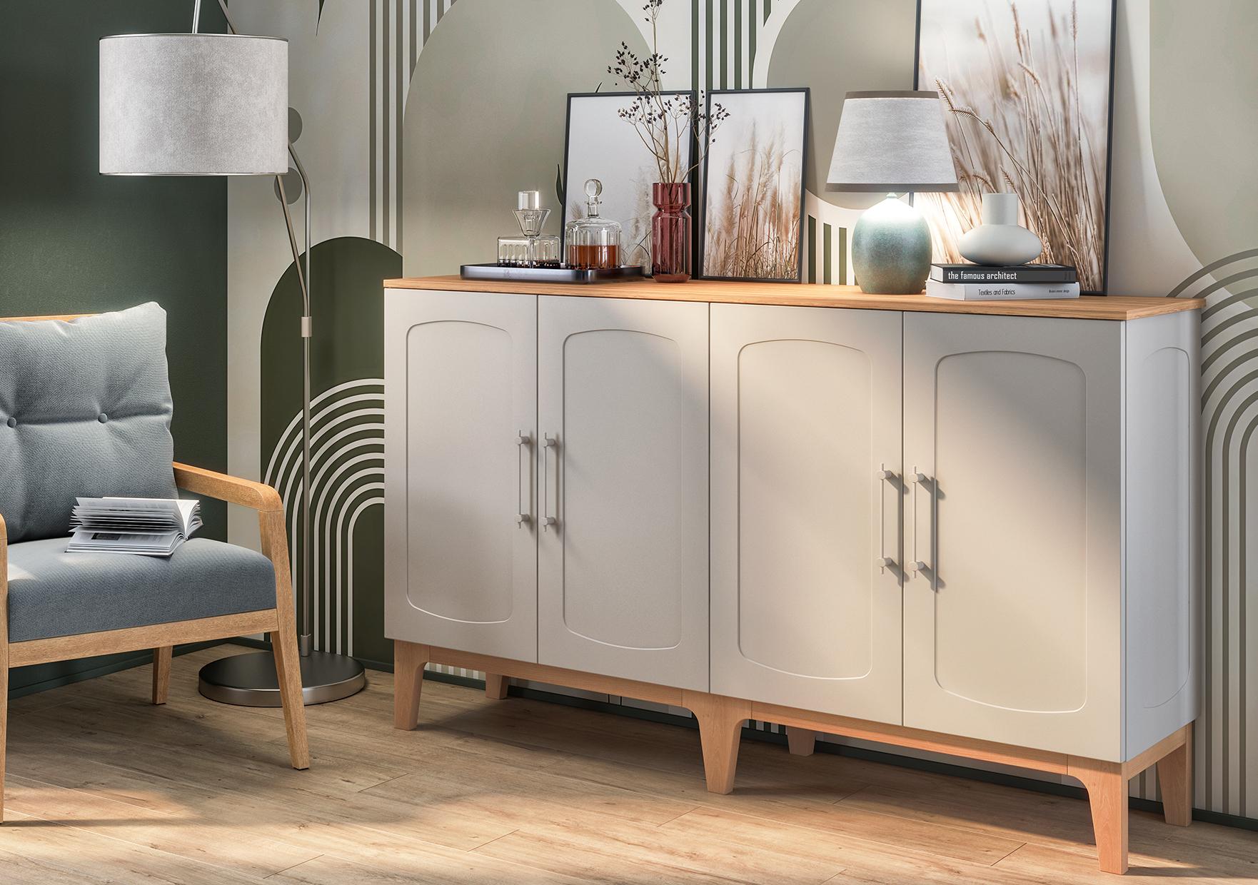 Изящные ножки из массива дерева придают композиции воздушность и визуально расширяют пространство, наполняя его светом. Инновационное матовое покрытие фасадов – это тактильное наслаждение, мягкая бархатистая поверхность, которая словно приглашает прикоснуться.