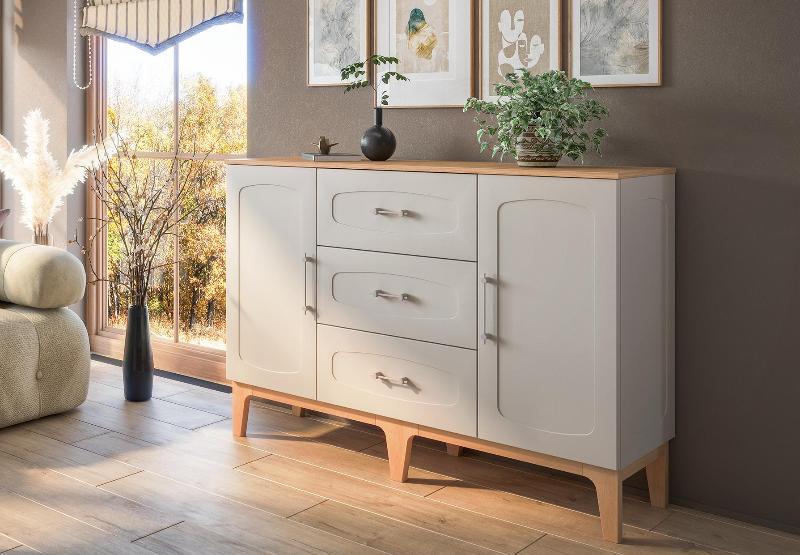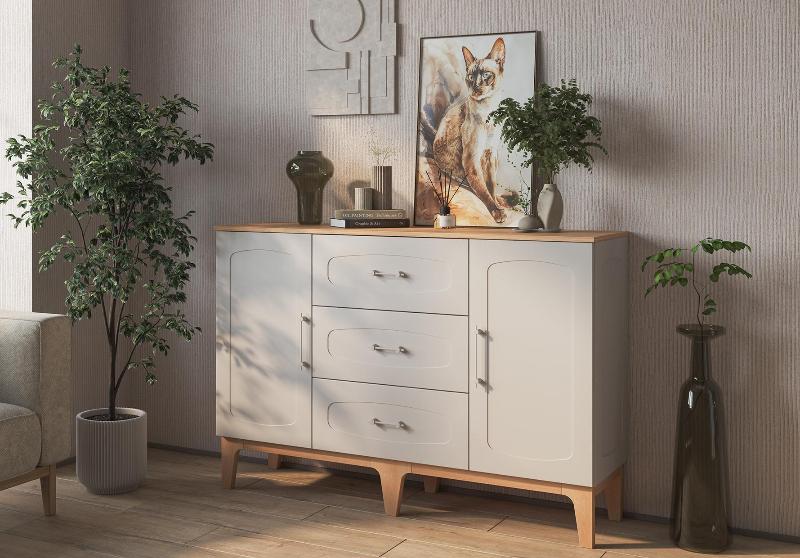 Изящные ножки из массива дерева придают композиции воздушность и визуально расширяют пространство, наполняя его светом. Инновационное матовое покрытие фасадов – это тактильное наслаждение, мягкая бархатистая поверхность, которая словно приглашает прикоснуться.