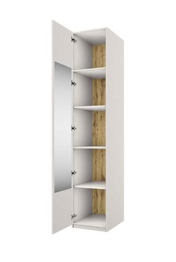 Шкаф 1DG Z MODERN - организация хранения предметов одежды и других вещей в любой по функционалу комнате наряду с другими элементами шкафной группы коллекции MODERN, с такой же высотой и глубиной. Также, данная модель создаст оптимальную функциональность и как отдельно стоящий предмет мебели, так как по конструкции предусмотрены глубокие полки ЛДСП и стационарная штанга. В свою очередь, это позволит хранить одежду на вешалках и складировать её, размещая на полках. При необходимости, некоторые полки можно изъять для навешивания и длинных и коротких вещей. Конструкция шкафа 1DG Z прямая, представляет одно отделение с полками ЛДСП и штангой за одной глухой дверью (1D). Кодировка «Z» обозначает наличие зеркала на внутренней стороне двери. Дверь распашная, крепится на петли к боковому корпусу изделия. Особенностью элемента являются вместительные полки за счёт глубины изделия, высота – 2300 мм, возможность составлять с элементами шкафной группы с такой же глубиной и высотой. Основные характеристики: Вес изделия: 64,71 кг. Корпус Материал: ЛДСП - 16 мм. Цвет: персидский жемчуг 810 PO. Полки: ЛДСП - 16 мм, цвет – персидский жемчуг 810 PO. Задняя стенка: ХДФ - 2,5 мм, цвет – дуб артисан. Кромка: меламиновая бумага - 0,3 мм, ПВХ – 0,4 мм, 1,8 мм, цвет – кашемир, дуб американский, дуб крафт золотой. Фасад Материал: ЛДСП – 16 мм, цвет – персидский жемчуг 810 PO; зеркало – 4 мм; общая толщина фасада – 20 мм. Фурнитура Ручки: металлические, SCHWINN. Петли: с доводчиками. Тон мебели может отличатся от фотографии на сайте.