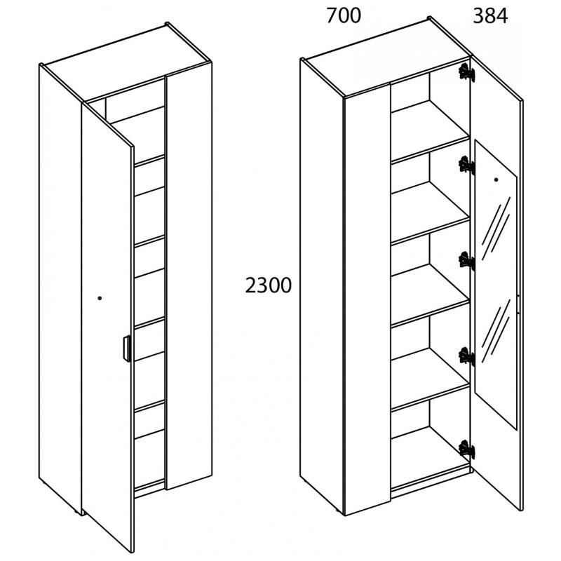 Шкаф 1D/K70 Z MODERN. Конструкция данной модели позволяет оформить угловые шкафные группы для большей оптимизации пространства. Можно установить в любом помещении по функционалу – гостиной, спальне, молодёжной/детской комнате, прихожей или гардеробной зоне. Конструкция шкафа 1D/K70 Z MODERN прямая, представляет одно отделение с полками ЛДСП за одной глухой дверью (1D) и стенкой передней (стационарная). Дверь распашная, крепится на петли к боковому корпусу изделия. Кодировка «Z» - наличие зеркала на внутренней стороне двери. Угловая композиция получается за счёт присоединения элементов шкафной группы глубиной 400 мм к стенке передней посредством крепежа. Особенностью элемента являются компактность, стильность, использование петель с доводчиками, высота – 2300 мм, установка угловой группы, практичная матовая текстура – персидский жемчуг.