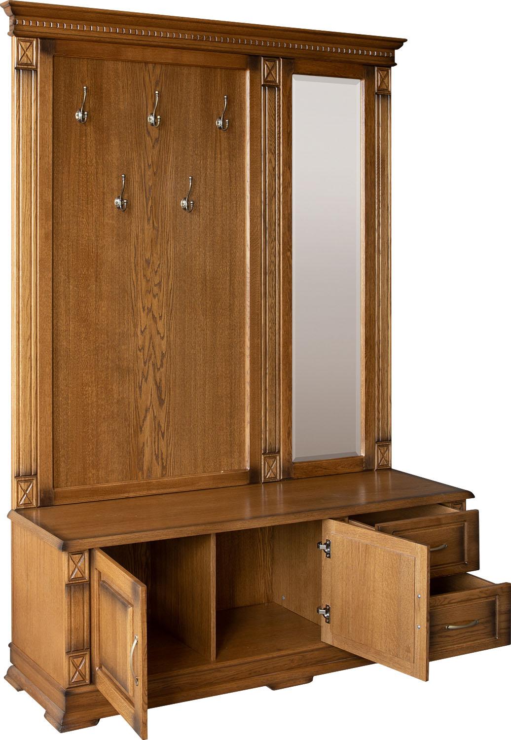 филёнка – массив дуба или стекло с фацетом. Крышки тумб представлены плитой ДСП, облицованной шпоном.